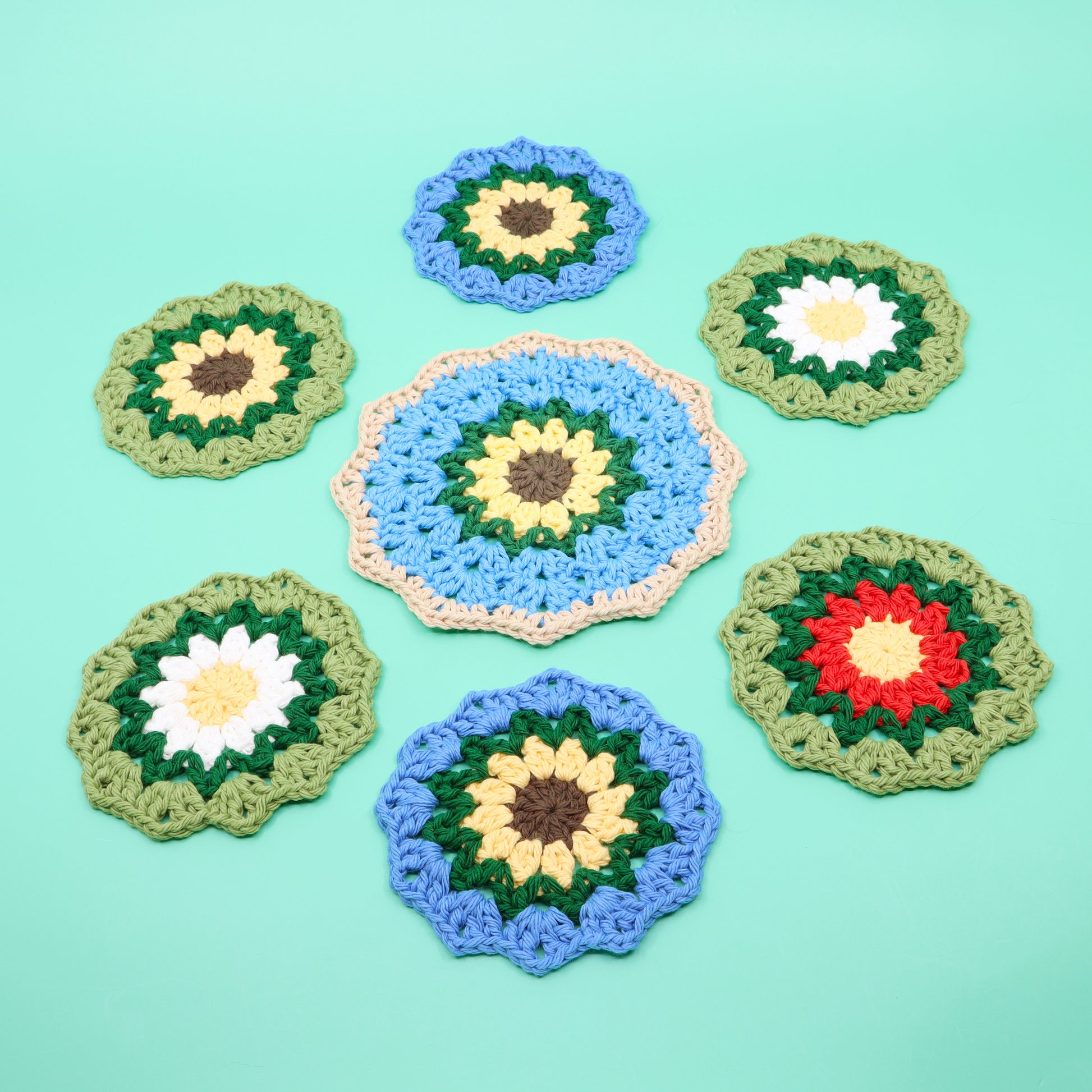 In this crochet pattern we’ll be crocheting flower pads and matching coasters, designed to serve as both practical hot pads and drink coasters, and delightful decorative accents. The coasters can be combined with a crocheted pot to make a secret succulent looking planter, where-as the 12 sided pad can even be transformed into a clock!